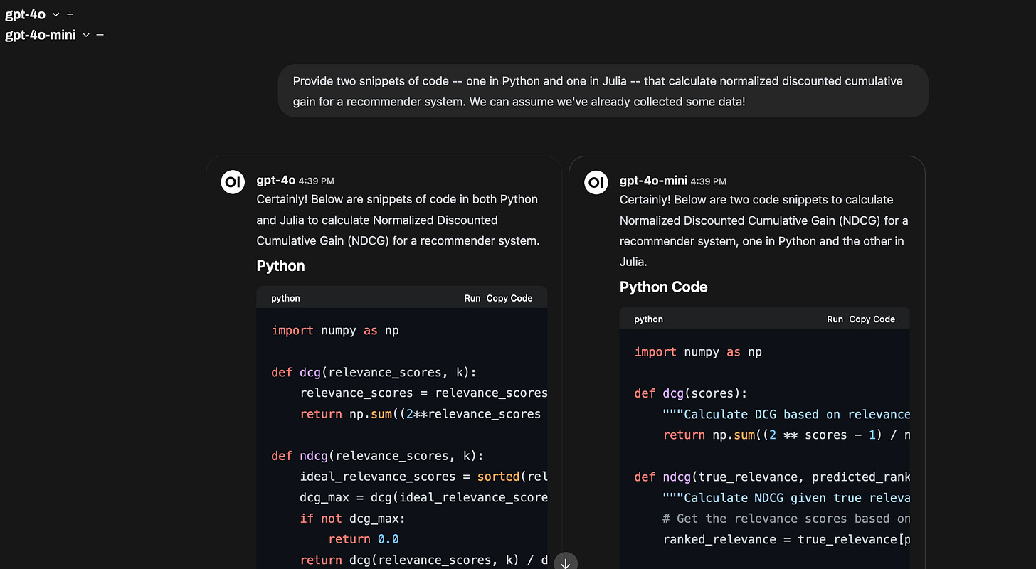 I believe the best way to interact with LLMs for many tasks will involve sending the same query to many models at once and viewing the results side-by-side (to start), and using more complex techniques to visualize the differences between responses. Perhaps these interfaces might highlight the “edit distance” between items, and drawing on my next point, looking to popular “diff” interfaces. Future interfaces could even go a step further and (1) allow users to “weave” together model interactions (efforts to make this easier are already underway) and (2) learn from user preferences over models.