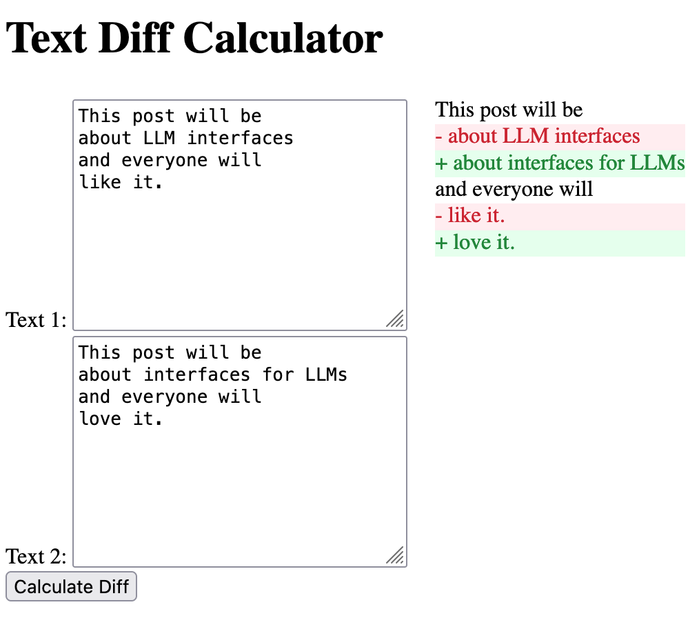 Next, I think LLM interfaces should really lean on interfaces used to display unix-style diff outputs as a way to communicate how artifacts change over time, even for non-coding contexts. We should be reading diffs a lot more often.
