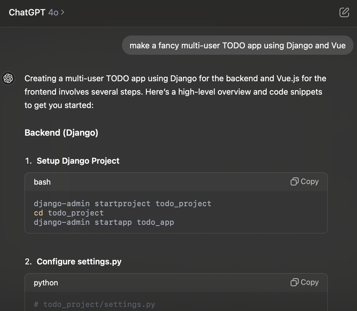 Imagine we want to use GPT 4o or Claude Sonnet 3.5 for something like, “make a fancy multi-user TODO app using Django and Vue”. The typical interaction could start by sending that query verbatim. The interfaces will give you some code (Claude can store “Artifacts” and ChatGPT will print directly into the chat). (See the Carlini post again for numerous examples of this kind of flow).