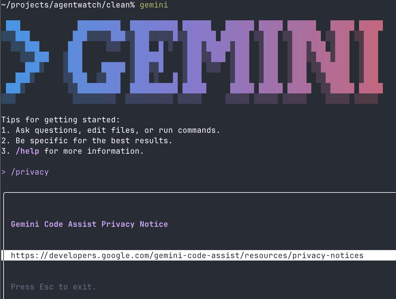 Gemini CLI does have a privacy command, which takes you to a rather complex “Gemini Code Assist: Terms of Service and Privacy Policies” page. There’s also this documentation page that is CLI-specific; there is no mention of deletion in the CLI docs. Depending on your account type, you may be exempt from training, but here I could not find any kind of interface for viewing or deleting individual chats. Further, usage by free-tier users is anonymized such that deletion is impossible. The advice for individuals is: “Please don't submit confidential information or any data you wouldn't want a reviewer to see or Google to use to improve our products, services, and machine-learning technologies.”